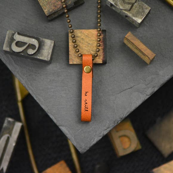 - Approximately 1/2" high x 1/4" wide x 1-5/8" long leather pendant, with writing burned into the leather's front surface.