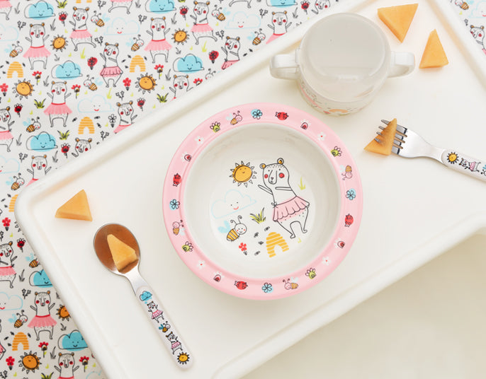 Our Bear Silverware Set is sized just right for little hands to grip! Featuring a fun design of a bear named Clementine, our silverware set is packaged in a re-usable carrying case that makes it easy to pack for everything from lunches to play dates, while providing a way to maintain clean silverware, or keep dirty silverware contained! Ready to guard its contents, the carrying case includes a space for writing your child's name on the front.