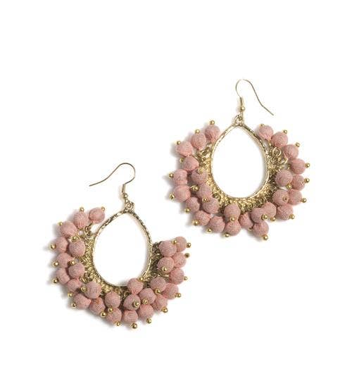 Our Blush Fabric Bead Earrings feature a beautiful chandelier earring design with soft blush and gold color designs.